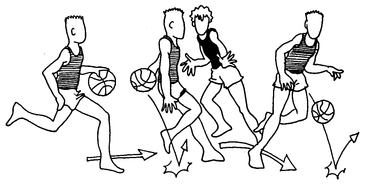 El primer bote quiero darlo en ventaja (iniciativa hombre-balón). Para ello necesitaré de un trabajo previo para desequilibrar al defensor (fintar = crear), continuando con cambio de ritmo y estaré dando el primer bote con ventaja.