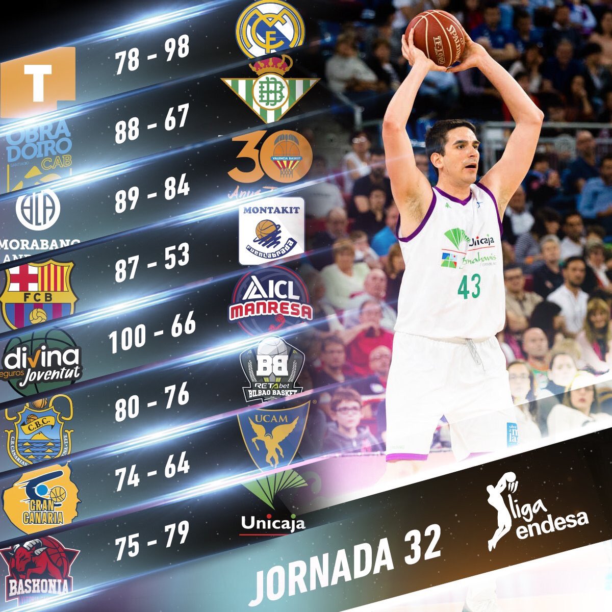 Importante victoria del Unicaja que aprieta más si cabe la clasificación por la parte alta. La lucha por los puestos de cabeza de serie en las eliminatorias por el título va a ser muy interesantes en las dos últimas jornadas.