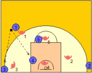En el diagrama 1 vemos como 1 intentará fijar a su exterior (aunque lo normal, como vemos en el gráfico es que su base le siga y su exterior (3) ajuste defensa en la esquina). Al mismo tiempo nuestro pivot de lado débil ganará la posición por delante de su pivot (5) situado en la parte central del poste alto., por otra parte nuestro pivot de lado fuerte (4) jugará situación de autobloqueo contra su defensor para ganar la posición el poste bajo. Por último, nuestro exterior de lado débil (2) ocupará esquina contraria.
