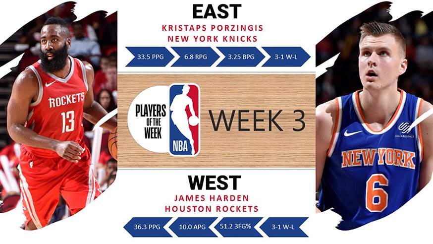 Una semana más traemos a los dos mejores jugadores de la semana en la NBA (entre el 30 de octubre y el 6 de noviembre). Esta vez han sido Kristaps Porzingis por la conferencia Este y James Harden por la conferencia Oeste los seleccionados, ambos con números de MVP.