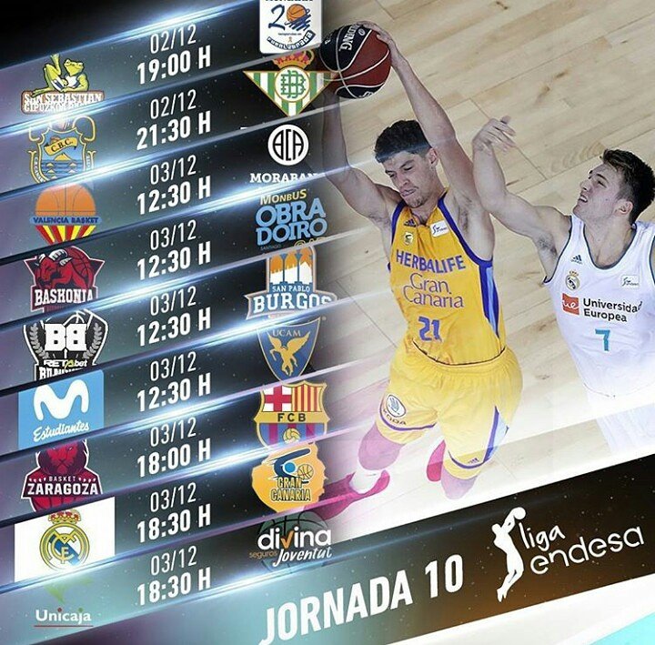 El gran partido de la jornada, entre dos de los mejores equipos de la Liga Endesa. El Real Madrid llega con muchs bajas, sobre todo en el juego interior, que están lastrando algo su rendimiento, sobre todo en Euroliga. Por su parte, los canarios, llegan como uno de los mejores ataques de la liga, con el recuerdo de la victoria del pasado año, y con ganas de saltar de nuevo la banca. El Real Madrid tendrá que ganar para mantener el liderato, ya que tiene a sus perseguidores muy cerca.