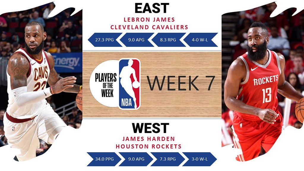 Llevamos siete semanas de NBA y ya ha transcurrido más de un mes de competición, por lo que la liga ha anunciado a los mejores jugadores de octubre/noviembre que, casualmente, coinciden con los mejores de la semana del 27 de noviembre al 4 de diciembre. Han nombrado a dos tópicos de la liga: James Harden en la Conferencia Oeste y LeBron James en la Conferencia Este.