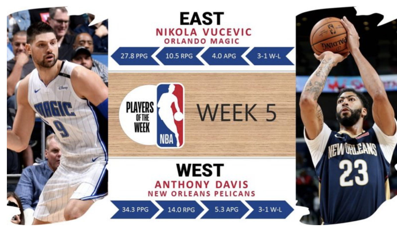 La quinta semana de la NBA se ha visto protagonizada por dos «grandes» jugadores, en ambos sentidos de la palabra. Nikola Vucevic y Anthony Davis recibieron el premio a «Mejor jugador de la semana» en sus respectivas conferencias, comprendida entre el 12 y el 18 de noviembre.