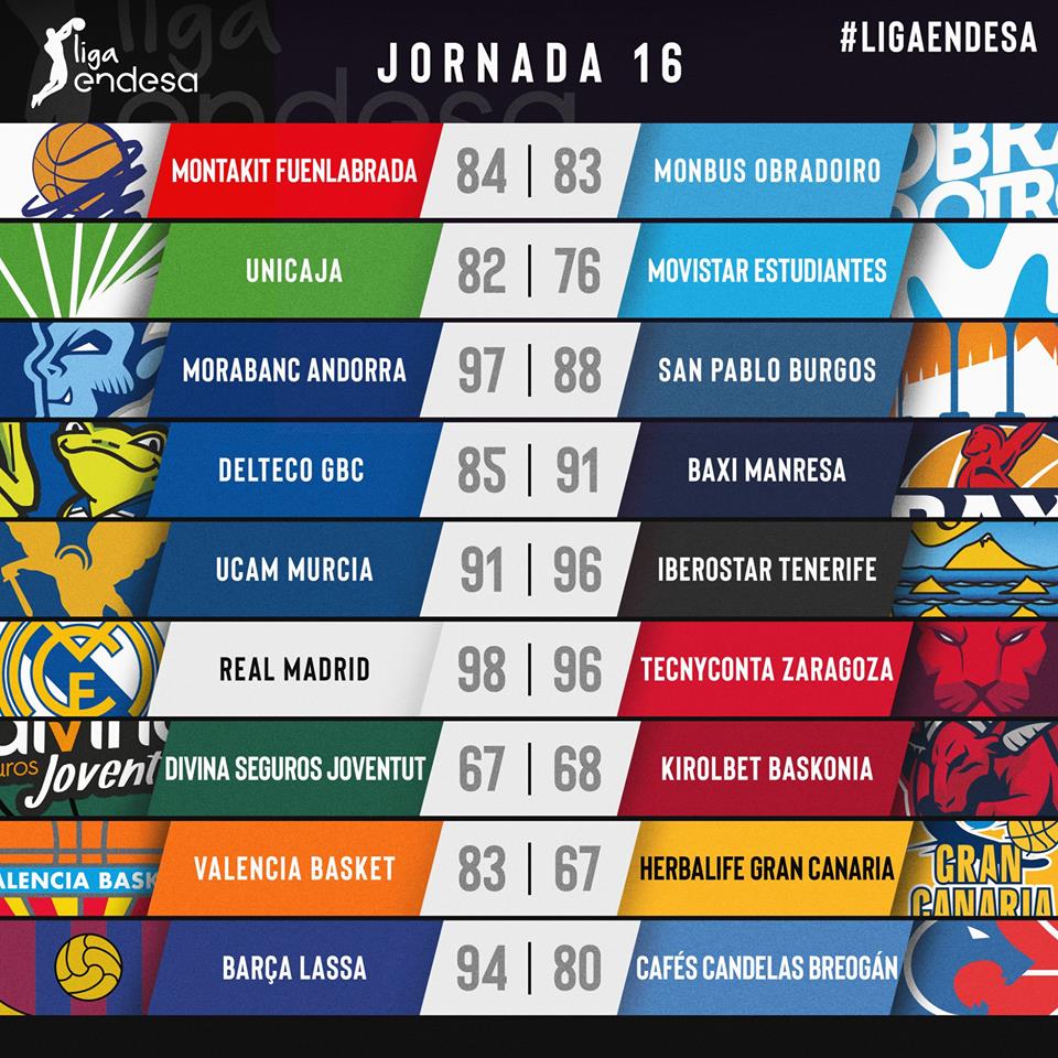 Con una lucha enternecida por entrar en la Copa del Rey, la decimosexta jornada de la Liga Endesa nos ha dejado ya a los cuatro cabezas de serie del torneo, Barça Lassa, Real Madrid, Kirolbet Baskonia y Unicaja Málaga.