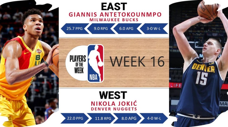 Los Nuggets iniciaron la Week 16 teniendo que remontar una desventaja de 25 puntos para acabar ganando a los Memphis Grizzlies (22-33) por 95-92. Después superaron por 105-99 a los New Orleans Pelicans (24-31) con 23+13+10 del pívot, a lo que le siguió una trabajada victoria sobre los Houston Rockets (32-25, quintos) de James Harden por 122-136, quien vio como una nueva marca de 30 puntos no podía hacer frente a Jokic (31+13+9). Para finalizar, los Minnnesota Timberwolves (25-28) sucumbieron por un ajustado 107-106.