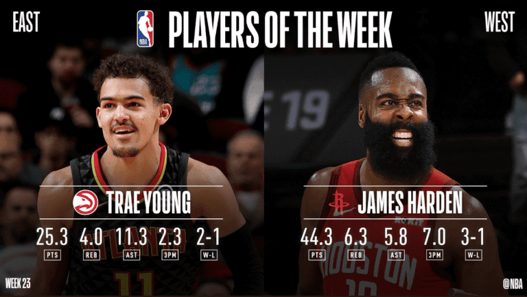 Durante la semana 23 de competición en la NBA hemos vislumbrado a dos individuos que se encuentran en plena carrera hacia dos de los títulos individuales de mayor relevancia en la liga. Trae Young ha sido el primer novato en ser reconocido esta temporada como mejor jugador de una semana, lo que le reaviva de lleno en la pelea por ser el mejor rookie del año, mientras que James Harden sigue a lo suyo y obtuvo el premio «Player of the Week» en el Oeste por cuarta vez en esta campaña.