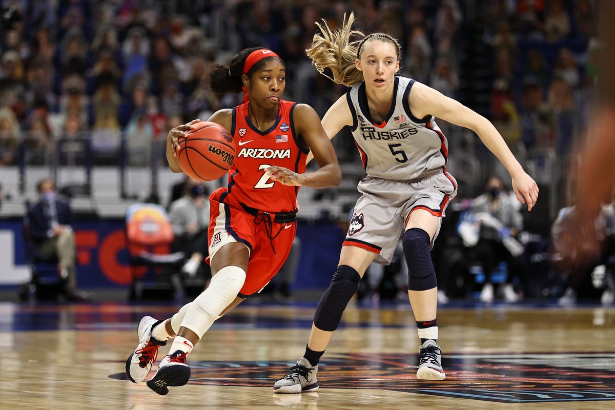 Arizona salió muy enchufada encestando tres triples seguidos, aunque se estancaron ligeramente en la recta final del primer cuarto. Aún así, su defensa les permitió ir 16-10 tras los diez minutos iniciales primer cuarto. Mientras Paige Bueckers permanecía anulada, quien solo pudo sumar 5 puntos en la primera parte, las de Adia Barnes seguían abriendo distancia. Aari McDonald llevaba un 4/7 en triples al descanso y llegarían al tercer cuarto ganando 32-22. La base senior concluyó con 26 puntos, 7 rebotes y 2 robos.