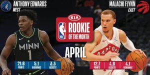 Aunque ya lo fue en marzo, el número 1 del Draft Anthony Edwards dejó de estar tapado definitivamente por otros rookies y en abril fue la estrella reconocida de los hundidos Timberwolves. Terminó con 345 puntos, 82 rebotes y 53 asistencias, números en un mes que no se conseguían desde Blake Griffin en enero del 2011. Minnesota ganó 8 encuentros y perdió otros 8, con Edwards promediando 21’6+5’1+3’3+1’6 robos por juego.