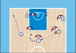 Mientras que en el gráfico 5, la jugadora 2 después de dar pase interior va hacia a 1 pero finta el bloqueo (lo que los americanos llaman slip the pick) convirtiéndose la acción en un “corte” hacia el aro.
