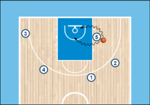 En el gráfico 3 el jugador/a con balón ya tiene un espacio libre para poder jugar. En este caso jugaríamos un pick and roll con 5, pero también podríais elegir otra opción como una penetración para forzar la ayuda y doblar a esquina, jugar otro mano a mano con 4 etc.